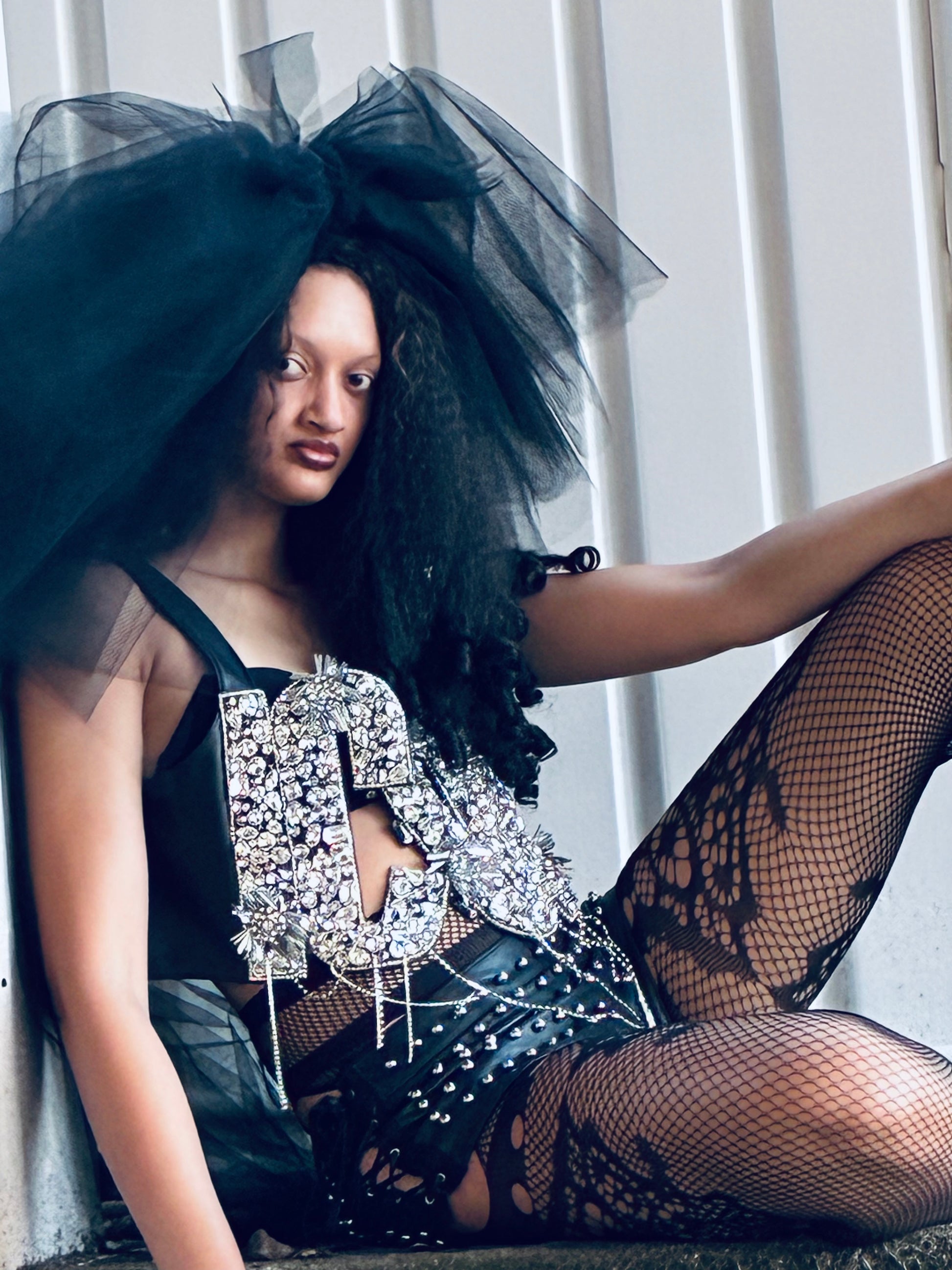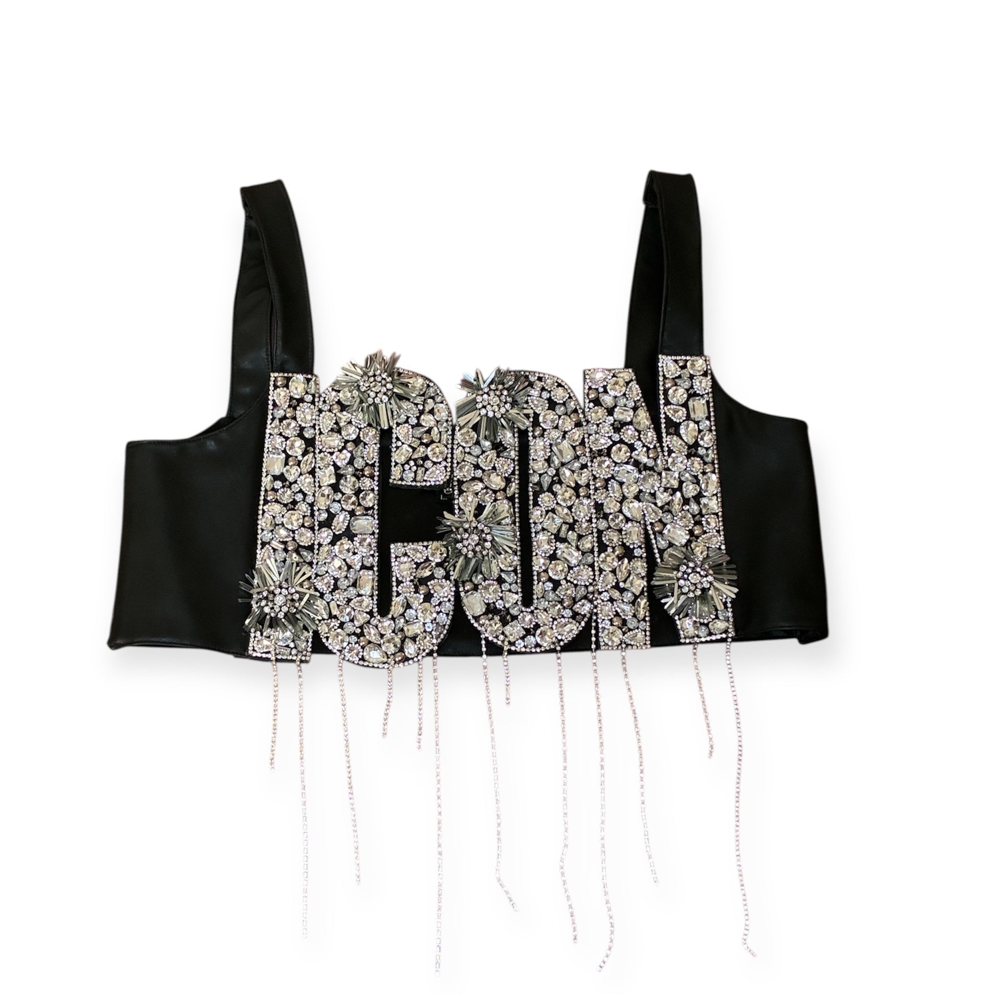 Every crystal is placed by hand, reinforced with stitching, and finished with cascading rhinestone fringe that moves with the body. The vest closes with a smooth back zipper for a secure, seamless fit, maintaining its clean architectural lines.