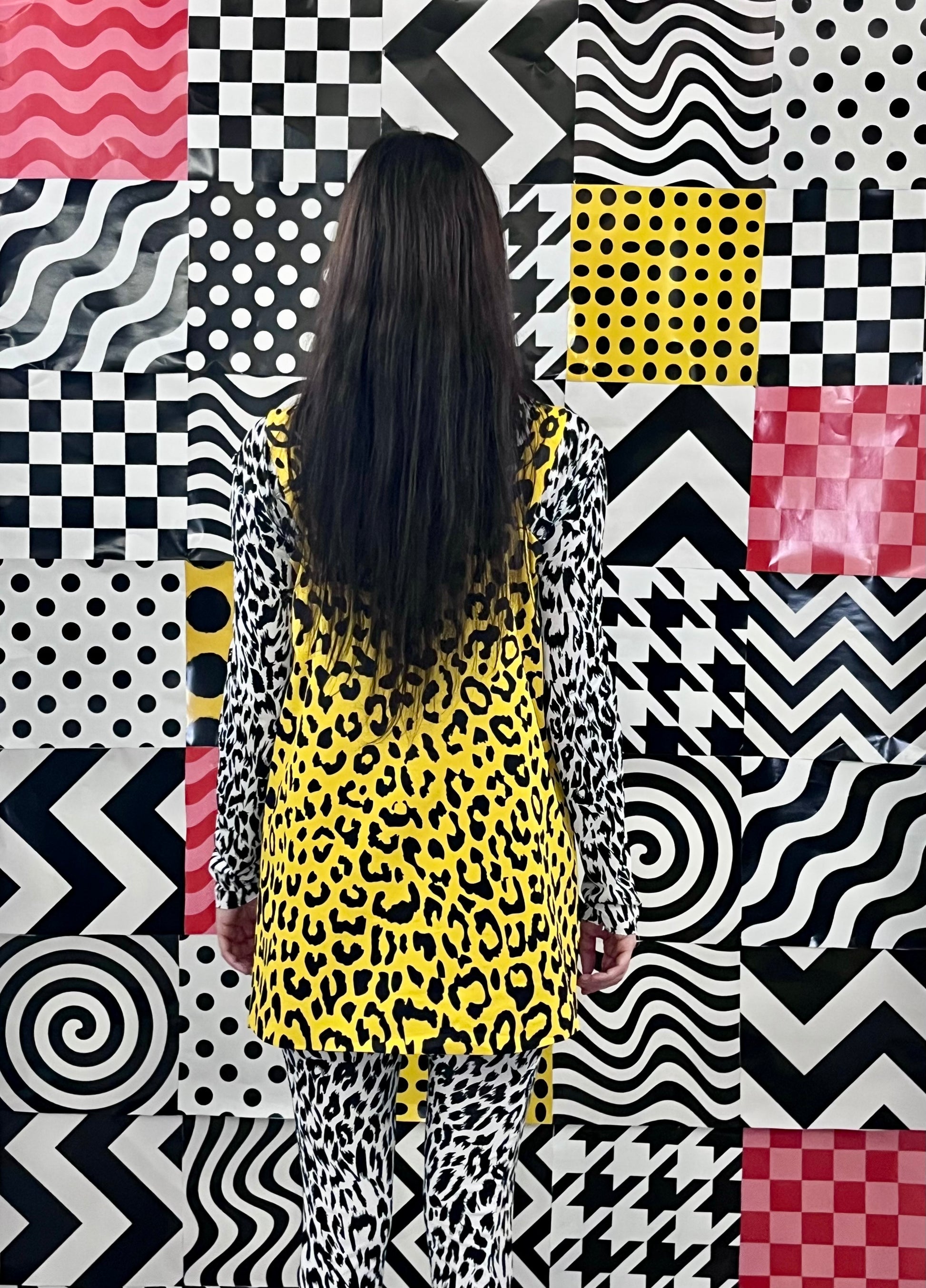 Sleeveless A-line dress in yellow and black cheetah print. Designed with two front lip-shaped pockets embroidered with black trim threading. Fully lined for comfort and coverage.